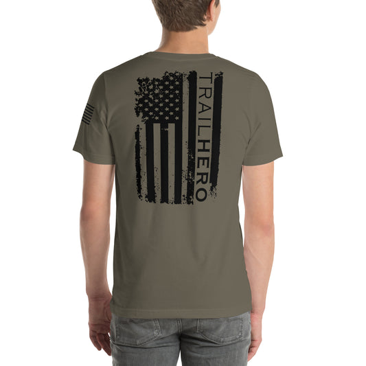 Trail Hero - Unisex - Bella 100% Cotton Black Logo Flag Tshirt - Army Green